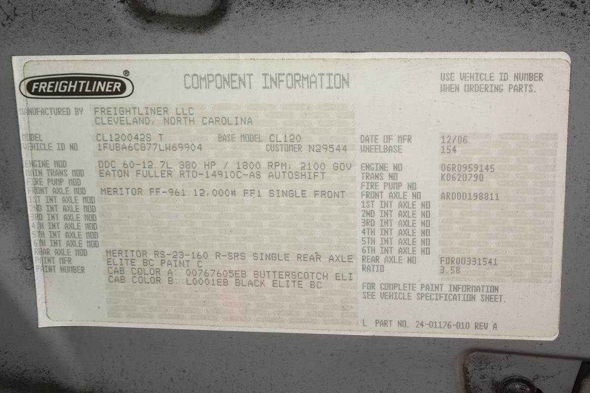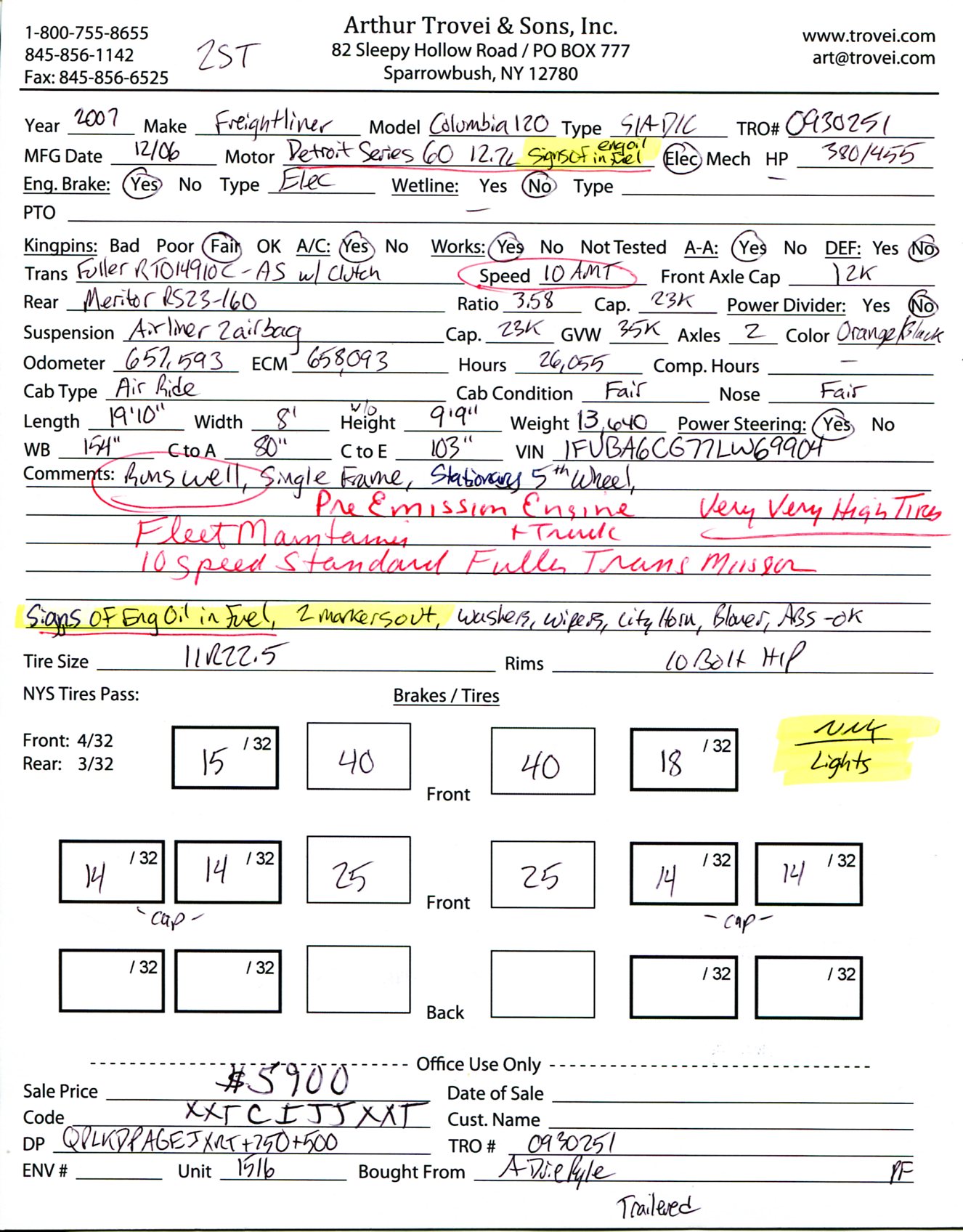 Inventory # 0930251Year: 2007 Make: Freightliner Model: Columbia 120 Type: Single Axle Day Cab Tractor VIN: 1FUBA6CG77LW69904 Motor: Detroit Series 60 12.7L Elec 380/455 HP - Signs Of Oil In Fuel Air to Air: Yes Air Conditioning: Yes (Works) Engine Brake: Electronic DEF: No Transmission: Fuller RTO14910C-AS 10 Speed Automated Manual Transmission With Clutch PTO: No Front Axle: 12,000 lb Rear: Meritor RS23-160 23,000 lb Ratio: 3.58 Power Divider: N/A Suspension: Airliner 2 Air Bag 23,000 lb Tires: 11R22.5 Rims: 10 Bolt Hub Pilot - Steel Odometer Reading: 657,593 ECM: 658,093 Hour Meter Reading: 26,055 ECM Hour Reading: Length: 19'10" Width: 8' Height: 9'9" Wheelbase: 154" Cab to Axle: 80" Cab to End: 103" Weight: 13,640 lbs GVW: 35,000 lb Added Features: Runs Well, Single Frame, Stationary 5th Wheel Price: $5,900 NNY 2STXXTCIJJXXTQPLKDPAGEJXRT+750+500 Terms of Sale
