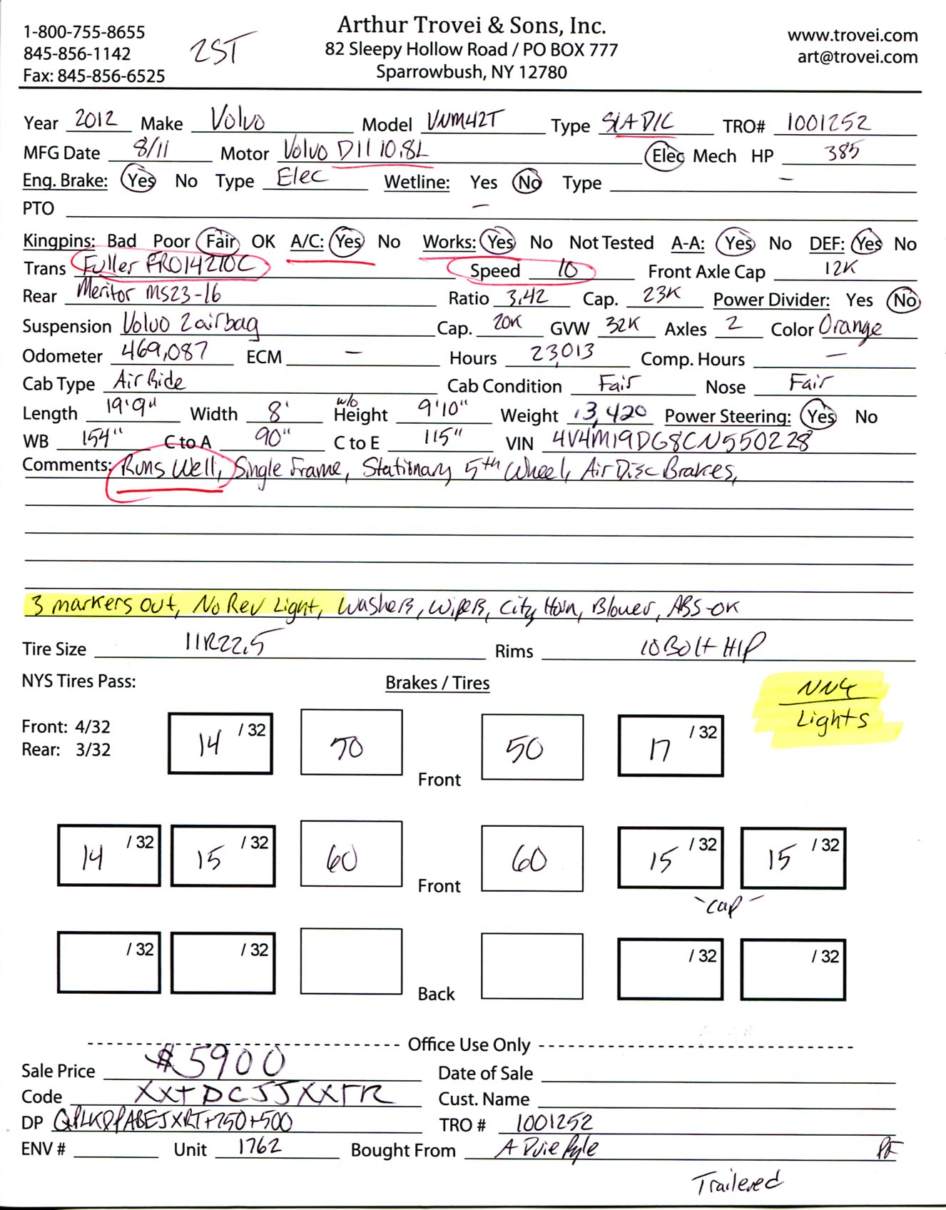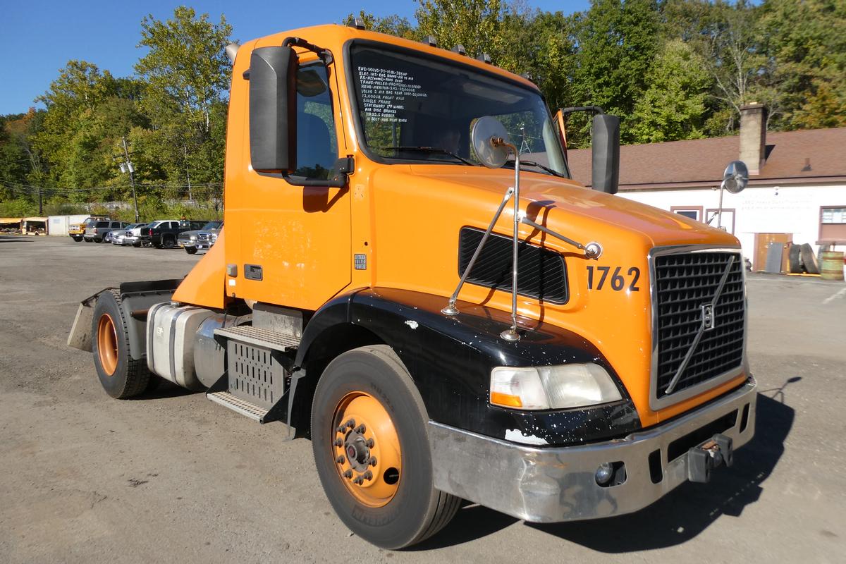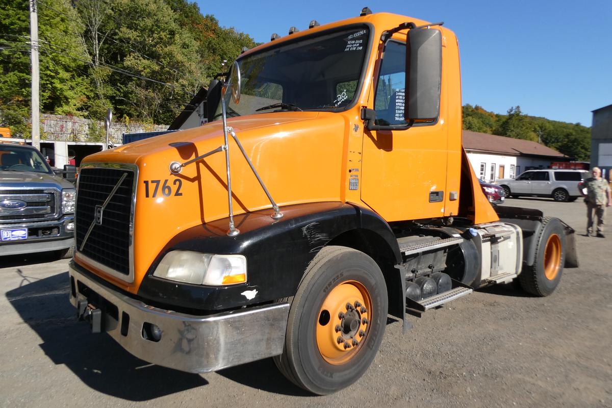 Inventory # 1001252Year: 2012 Make: Volvo Model: VNM42T Type: Single Axle Day Cab Tractor VIN: 4V4M19DG8CN550228 Motor: Volvo D11 10.8L Elec 385 HP Air to Air: Yes Air Conditioning: Yes (Works) Engine Brake: Electronic DEF: Yes Transmission: Fuller FRO14210C 10 Speed PTO: No Front Axle: 12,000 lb Rear: Meritor MS23-16 23,000 lb Ratio: 3.42 Power Divider: No Suspension: Volvo 2 Air Bag 20,000 lb Tires: 11R22.5 Rims: 10 Bolt Hub Pilot - steel Odometer Reading: 469,087 ECM: Hour Meter Reading: 23,013 ECM Hour Reading: Length: 19'9" Width: 8' Height w/ Fairing: 12' Wheelbase: 154" Cab to Axle: 90" Cab to End: 115" Weight: 13,420 lb GVW: 32,000 lb Added Features: Runs Well, Single Frame, Stationary 5th Wheel, Air Disc Brakes Price: $5,900 NNY 2STXXTDCJJXXTRQPLKDPABEJXRT+750+500 Terms of Sale
