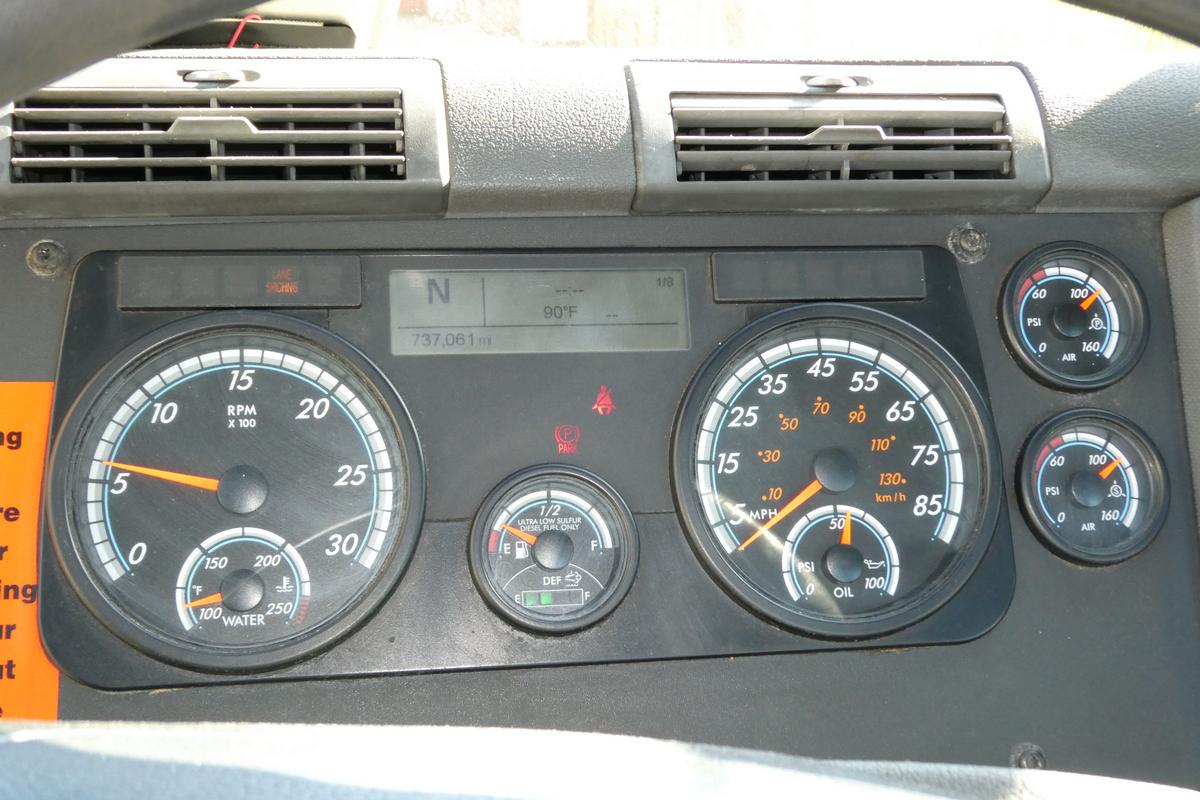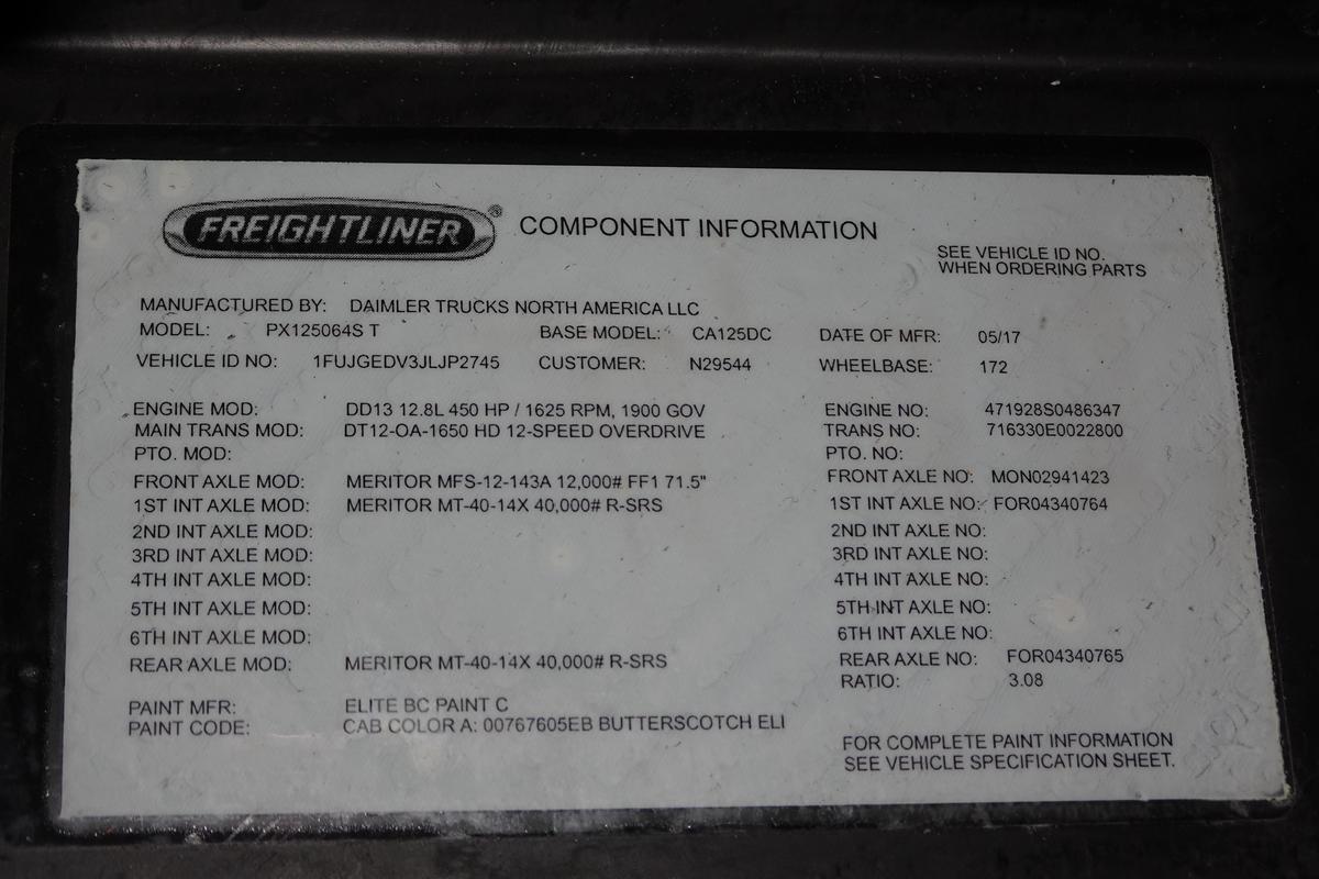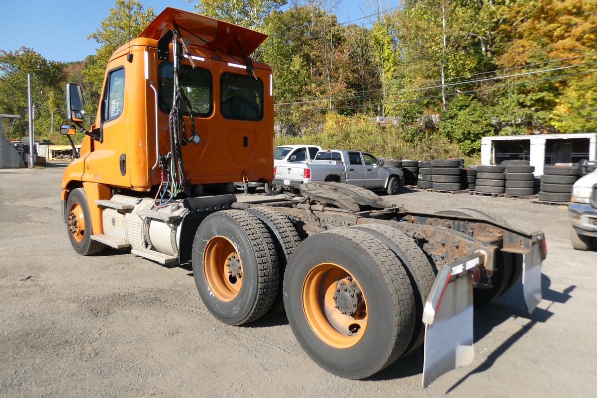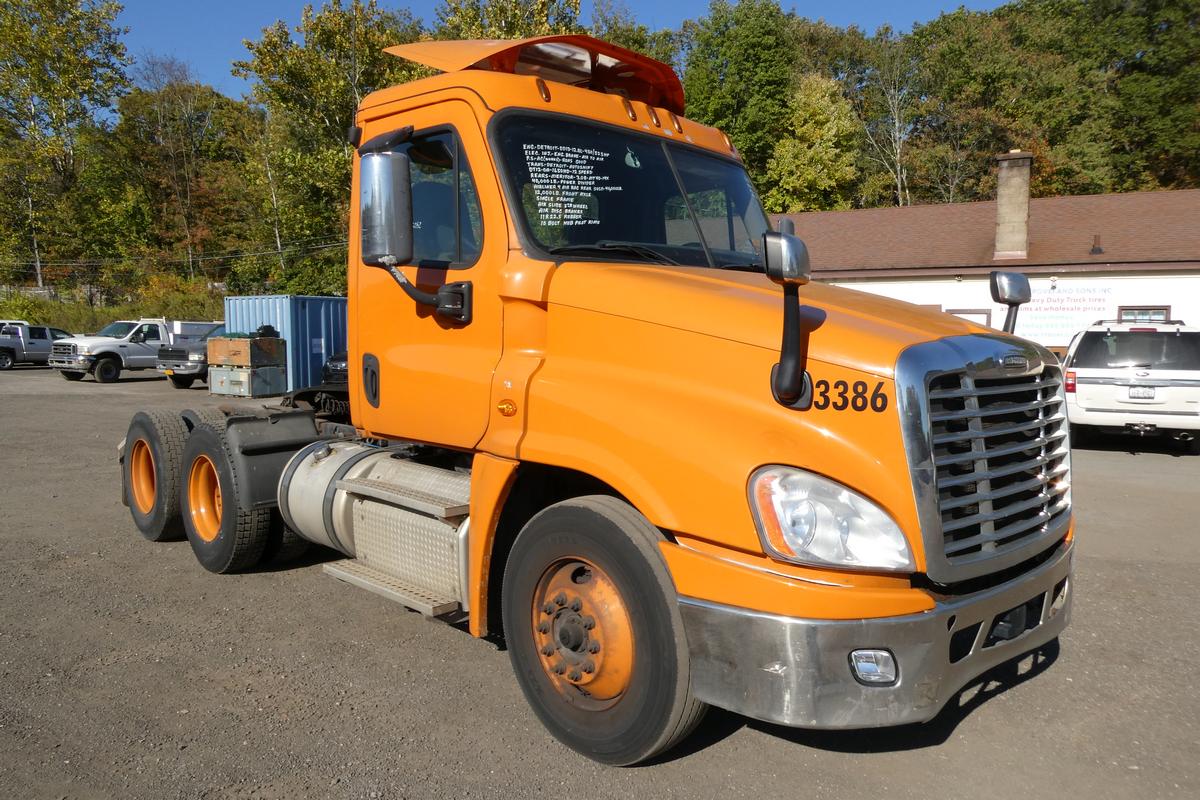 Inventory # 1006252Year: 2018 Make: Freightliner Model: Cascadia 125 Type: Tandem Axle Day Cab Tractor VIN: 1FUJGEDV3JLJP2745 Motor: Detroit DD13 12.8L Elec 450/500 HP Air to Air: Yes Air Conditioning: Yes (Works) Engine Brake: Electronic DEF: Yes Transmission: Detroit DT12-OA-1650HD 12 Speed Automated Manual (Clutchless) PTO: No Front Axle: 12,000 lb Rear: Meritor MT40-14X 40,000 lb Ratio: 3.08 Power Divider: Yes Suspension: Airliner 4 Air Bag 40,000 lb Tires: 11R22.5 Rims: 10 Bolt Hub Pilot - Steel Odometer Reading: 737,060 ECM: 12,366 Hour Meter Reading: 20,763 ECM Hour Reading: Length: 23' Width: 8' Height w/ Fairing Down: 10'6" Wheelbase: 172" Cab to Axle: 96" Cab to End: 140" Weight: 15,860 lb GVW: 52,000 lb Added Features: Runs Well, Single Frame, Air Slide 5th Wheel, Air Disc Brakes Price: $9,900 NNY 3RVXXTGIJJXXTRQPLKDPBGEJXRT+750+500 Terms of Sale
