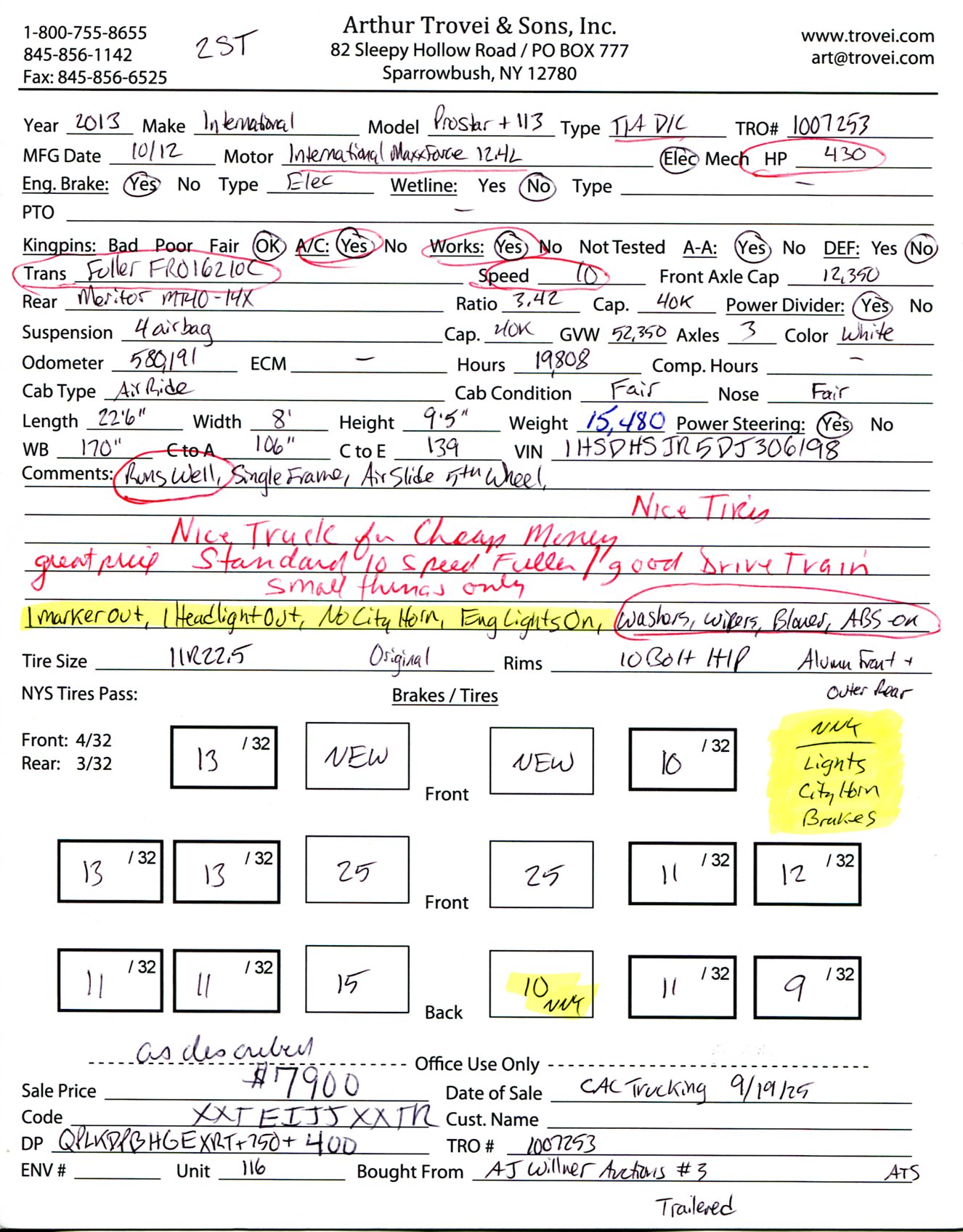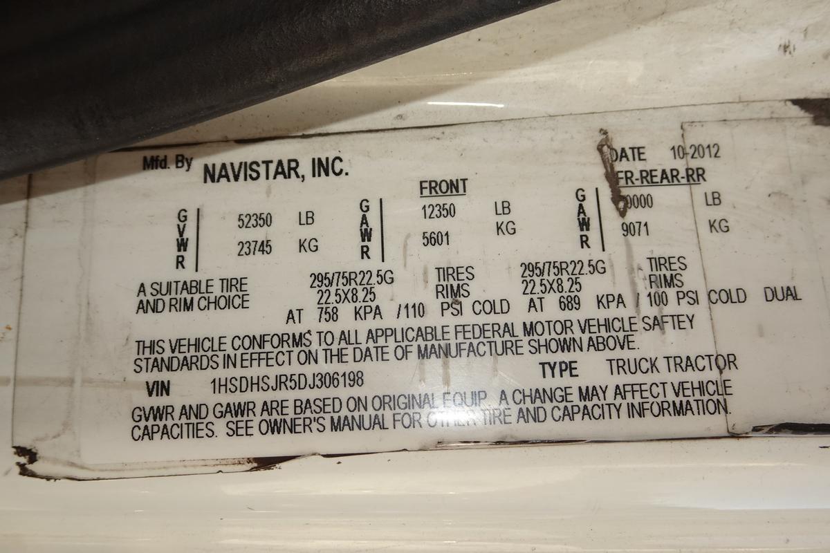 Inventory # 1007253Year: 2013 Make: International Model: Prostar+ 113 Type: Tandem Axle Day Cab Tractor VIN: 1HSDHSJR5DJ306198 Motor: International Maxxforce 12.4L Elec 430 HP Air to Air: Yes Air Conditioning: Yes (Works) Engine Brake: Electronic DEF: Yes Transmission: Fuller FRO16210C 10 Speed PTO: No Front Axle: 12,350 lb Rear: Meritor MT40-14X 40,000 lb Ratio: 3.42 Power Divider: Yes Suspension: 4 Air Bag 40,000 lb Tires: 11R22.5 Rims: 10 Bolt Hub Pilot - Aluminum Front And Outer Rear Odometer Reading: 580,191 ECM: Hour Meter Reading: 19,808 ECM Hour Reading: Length: 22'6" Width: 8' Height: 9'5" Wheelbase: 170" Cab to Axle: 106" Cab to End: 139" Weight: 15,480 lb GVW: 52,350 lb Added Features: Runs Well, Single Frame, Air Slide 5th Wheel Price: $7,900 as described NNY 2STXXTEIJJXXTRQPLKDPBHGEXRT+750+400 Terms of Sale