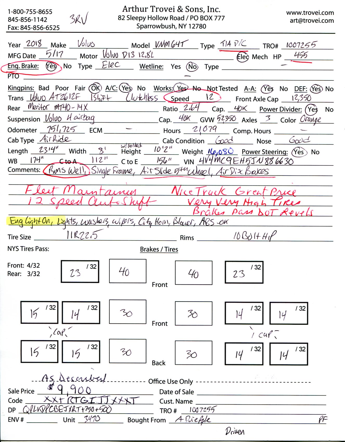 Inventory # 1007255Year: 2018 Make: Volvo Model: VNM64T Type: Tandem Axle Day Cab Tractor VIN: 4V4MC9EH5JN886630 Motor: Volvo D13 12.8L Elec 455 HP - Engine Light On Air to Air: Yes Air Conditioning Yes (Works) Engine Brake: Electronic DEF: Yes Transmission: Volvo AT2612F IShift (Clutchless) 12 Speed Automated Manual PTO: N/A Front Axle: 12,350 lb Rear: Meritor MT40-14X 40,000 lb Ratio: 2.64 Power Divider: Yes Suspension: Volvo 4 Air Bag 40,000 lb Tires: 11R22.5 Rims: 10 Bolt Hub Pilot - Steel Odometer Reading: 751,725 ECM Reading: Hour Meter Reading: 21,079 ECM Hour Reading: Length: 23'4" Width: 8' Height w/ Fairing Folded: 10'2" Wheelbase: 174" Cab to Axle: 112" Cab to End: 156" Weight: 16,080 lb GVW: 52,350 lb Added Details: Runs Well - Engine Light On, Single Frame, Air Slide 5th Wheel, Air Disc Brakes Price: $9,900 as described 3RVXXTRTGIJJXXTQPLKDPCBEJXRT+750+500 Terms of Sale