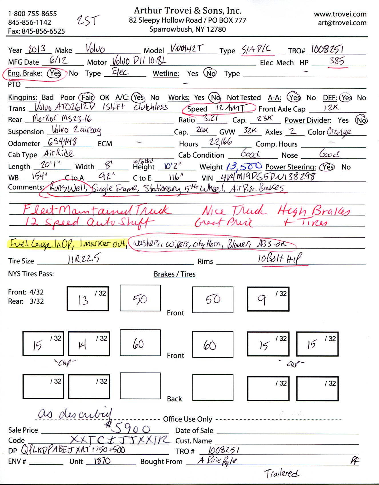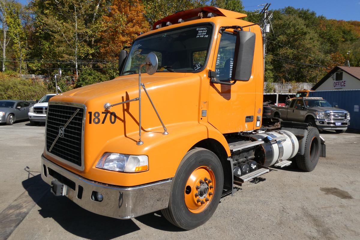 Inventory # 1008251Year: 2013 Make: Volvo Model: VNM42T Type: Single Axle Day Cab Tractor VIN: 4V4M19DG5DN138298 Motor: Volvo D11 10.8L Elec 385 HP Air to Air: Yes Air Conditioning: Yes (Not Working) Engine Brake: Electronic DEF: Yes Transmission: Volvo ATO2612D IShift (Clutchless) 12 Speed Automated Manual PTO: No Front Axle: 12,000 lb Rear: Meritor MS23-16 23,000 lb Ratio: 3.21 Power Divider: No Suspension: Volvo 2 air bag 20,000 lb Tires: 11R22.5 Rims: 10 bolt hub pilot - steel Odometer Reading: 654,448 ECM: Hour Meter Reading: 22,166 ECM Hour Reading: Length: 20'1" Width: 8' Height w/ Fairing Folded: 10'2" Wheelbase: 154" Cab to Axle: 90" Cab to End: 115" Weight: 13,500 lbs GVW: 32,000 lbs Added Features: Runs Well, Single Frame, Stationary 5th Wheel, Air Disc Brakes Price: $5,900 as described 2STXXTCIJJXXTRQPLKDPABEJXRT+750+500 Terms of Sale