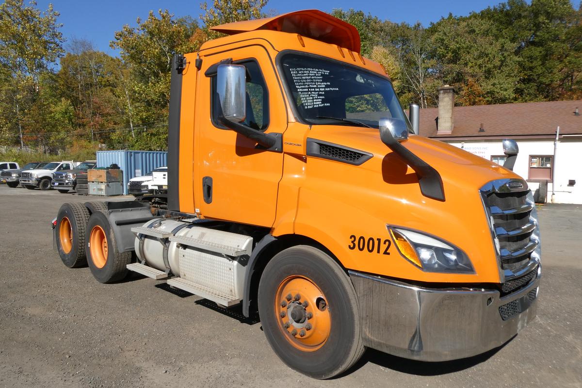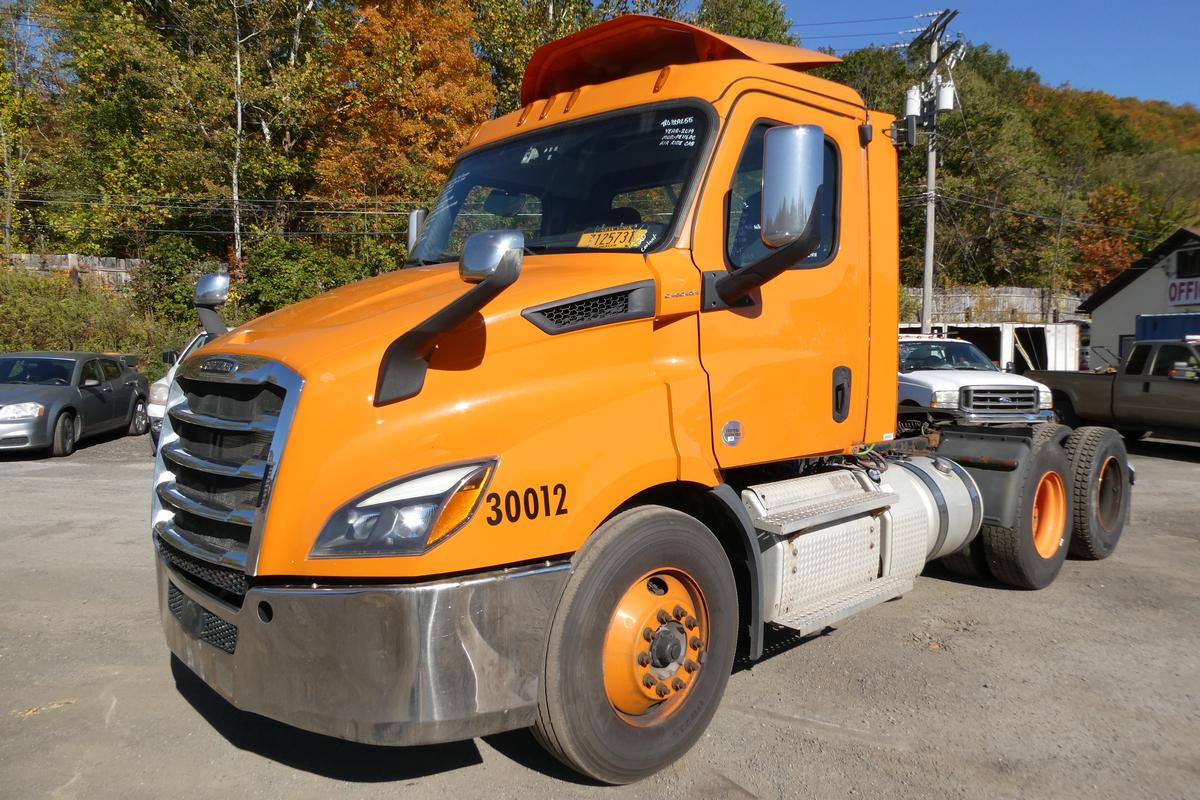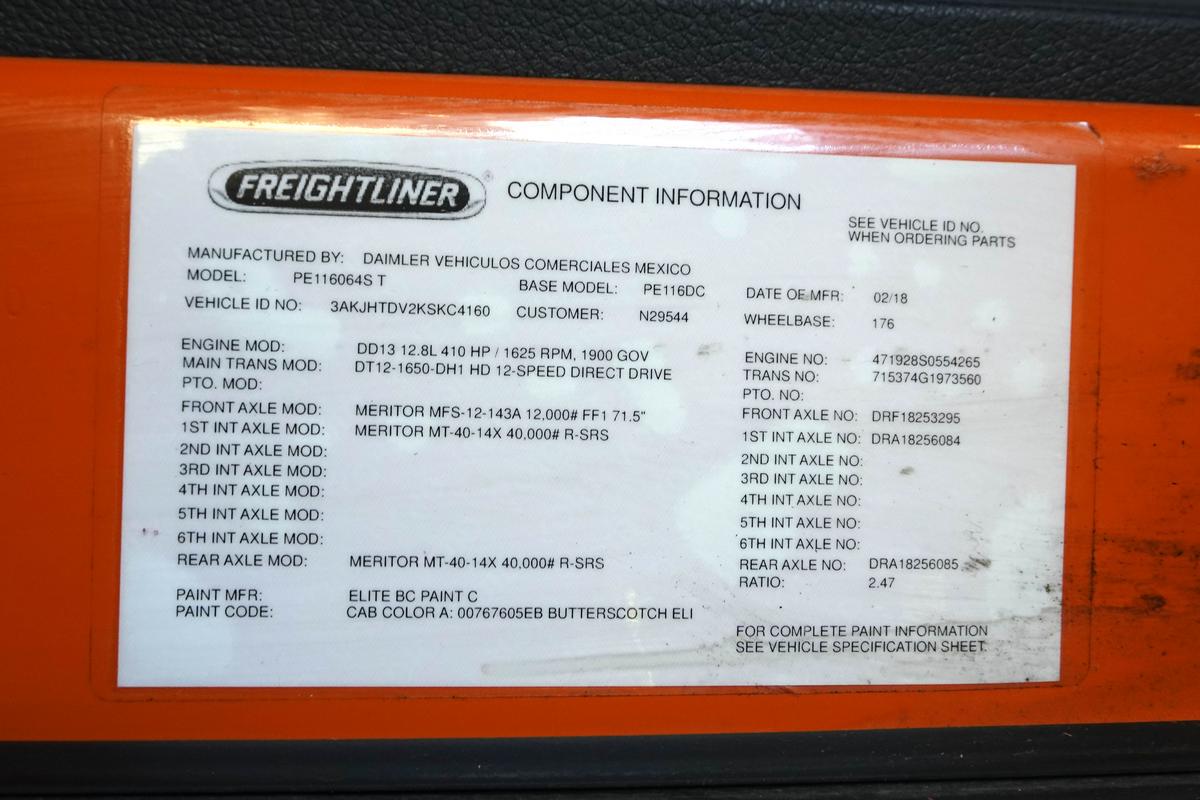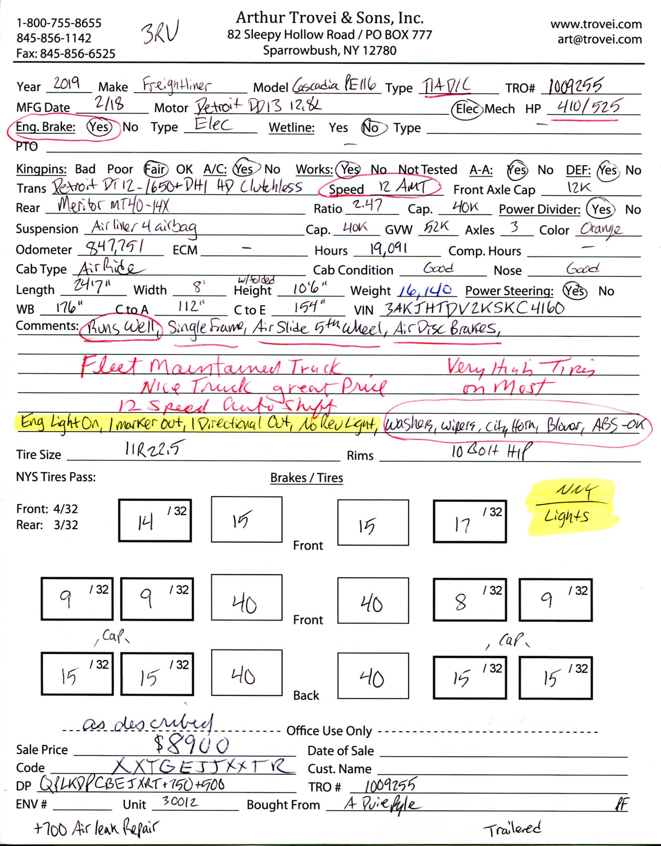 Inventory # 1009255Year: 2019 Make: Freightliner Model: Cascadia PE116 Type: Tandem Axle Day Cab Tractor VIN: 3AKJHTDV2KSKC4160 Motor: Detroit DD13 12.8L elec 410/525 hp Air to Air: Yes Air Conditioning: Yes (Works) Engine Brake: Electronic DEF: Yes Transmission: Detroit DT12-1650-DH1 HD 12 Speed Automated Manual (Clutchless) PTO: No Front Axle: 12,000 lb Rear: Meritor MT40-14X 40,000 lb Ratio: 2.47 Power Divider: Yes Suspension: Airliner 4 air bag 40,000 lb Tires: 11R22.5 Rims: 10 bolt hub pilot - steel Odometer Reading: 847,751 ECM: Hour Meter Reading: 19,091 ECM Hour Reading: Length: 24'7" Width: 8' Height w/ Fairing Folded: 10'6" Wheelbase: 176" Cab to Axle: 112" Cab to End: 154" Weight: 16,140 lb GVW: 52,000 lb Added Features: Runs Well - Engine Light On, Single Frame, Air Slide 5th wheel, Air Disc Brakes Price: $8,900 as decribed NNY 3RVXXTGEJJXXTRQPLKDPCBEJXRT+750+500+700 Terms of Sale