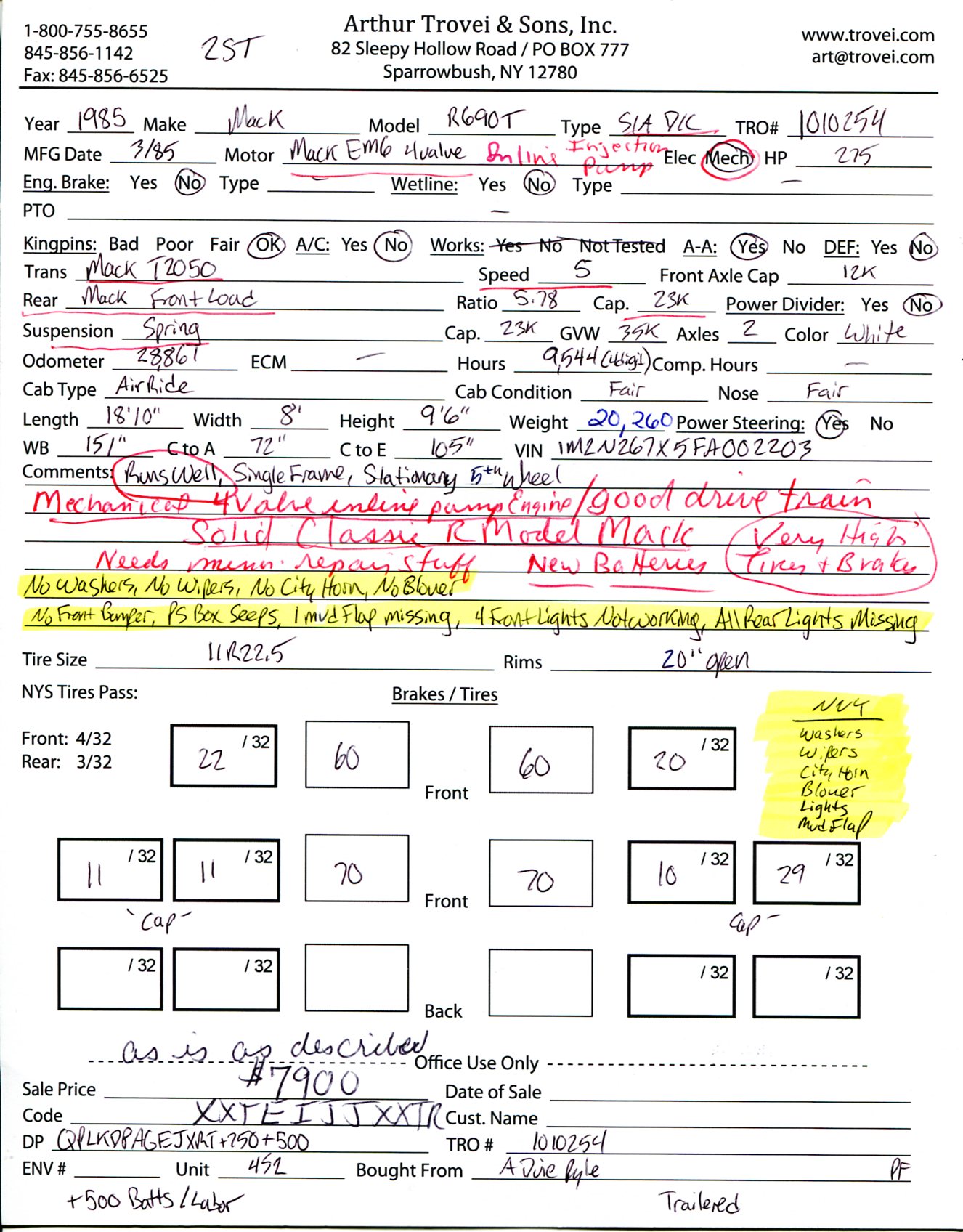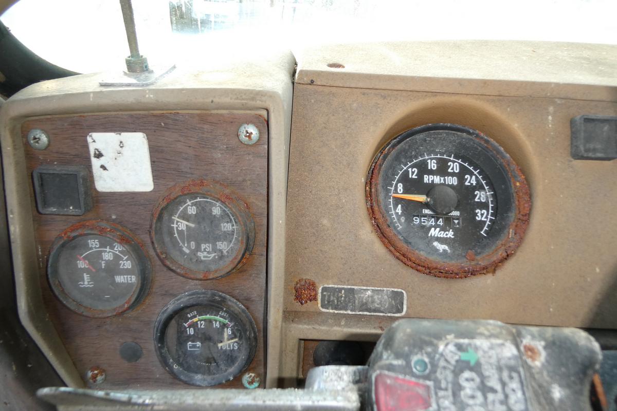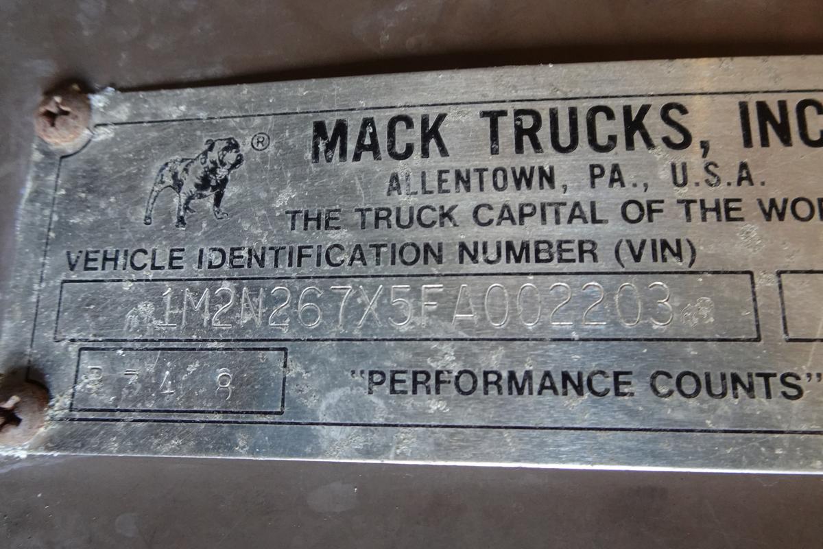 Inventory # 1010254Year: 1985 Make: Mack Model: R690T Type: Single Axle Day Cab Tractor VIN: 1M2N267X5FA002203 Motor: Mack EM6 4 Valve Mech 275 HP Air to Air: Yes Air Conditioning: No Engine Brake: No DEF: No Transmission: Mack T2050 5 Speed PTO: N/A Front Axle: 12,000 lb Rear: Mack Front Load 23,000 lb Ratio: 5.78 Power Divider: No Suspension: Spring 23,000 lb Tires: 11R22.5 Rims: 20" Open Odometer Reading: 28,861 ECM Reading: Hour Meter Reading: 9,544 (4 Digit) ECM Hour Reading: Length: 18'10" Width: 8' Height: 9'6" Wheelbase: 151" Cab to Axle: 72" Cab to End: 105" Weight: 20,260 lb (Concrete Counterweight) GVW: 35,000 lb Added Details: Runs Well, Single Frame, Stationary 5th Wheel Price: $7,900 as is as described NNY 2STXXTEIJJXXTRQPLKDPAGEJXRT+750+500+500 Terms of Sale