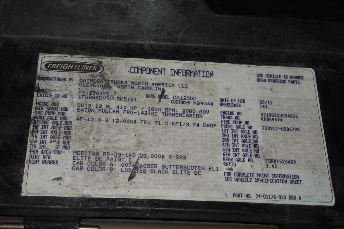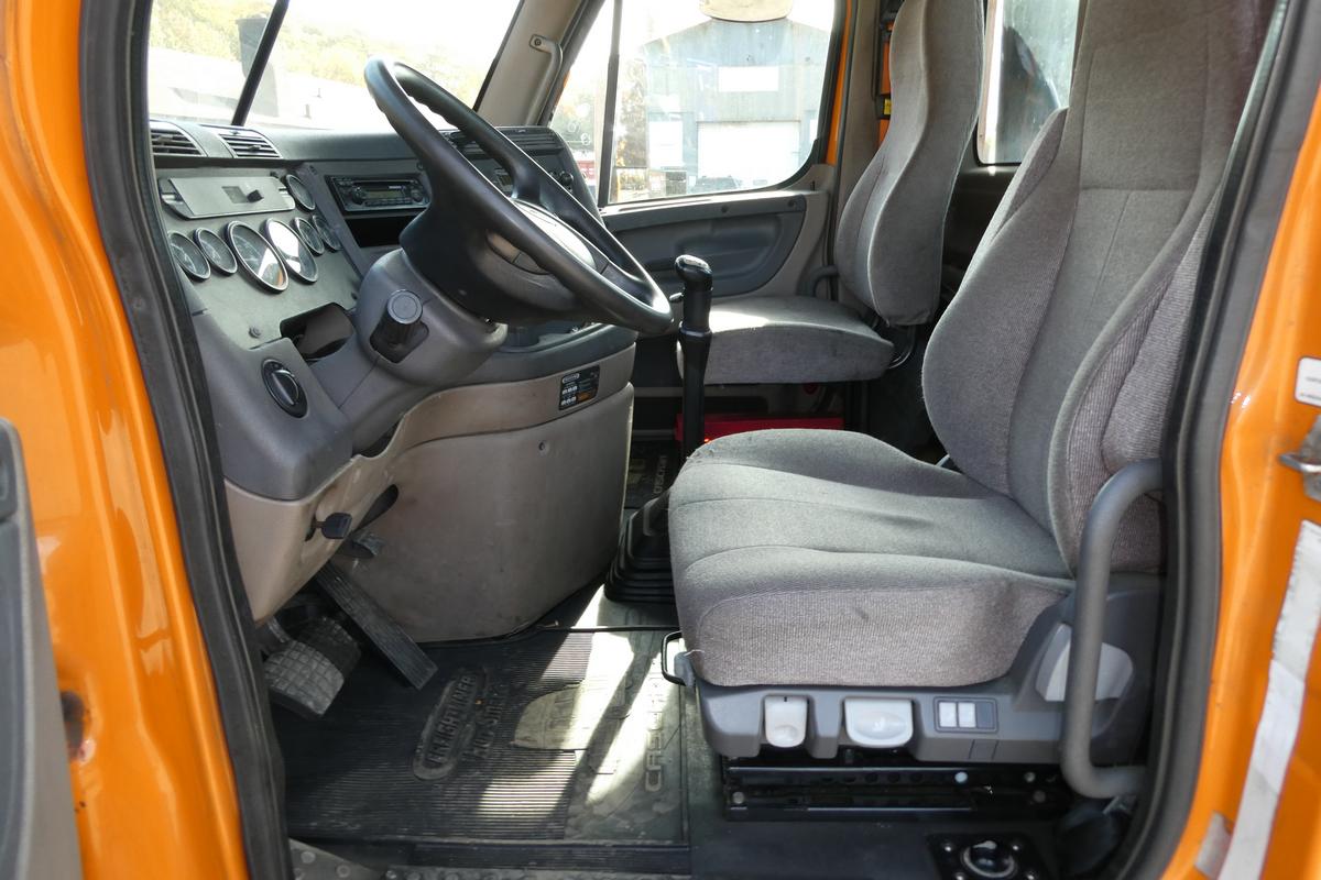 Inventory # 1013252Year: 2012 Make: Freightliner Model: Cascadia 125 Type: Single Axle Day Cab Tractor VIN: 1FUBGEDV9CLBK5181 Motor: Detroit DD13 12.8L Elec 410/500 HP Air to Air: Yes Air Conditioning: Yes (Works) Engine Brake: Electronic DEF: Yes Transmission: Fuller FRO14210C 10 Speed PTO: No Front Axle: 12,000 lb Rear: Meritor RS23-160 23,000 lb Ratio: 3.42 Power Divider: No Suspension: Airliner 2 Air Bag 23,000 lb Tires: 11R22.5 Rims: 10 Bolt Hub Pilot - Steel Odometer Reading: 538,412 ECM: 538,381 Hour Meter Reading: 1,212* ECM Hour Reading: Length: 20'6" Width: 8' Height: 10' Wheelbase: 161" Cab to Axle: 86" Cab to End: 108" Weight: 14,060 lb GVW: 35,000 lb Added Features: Runs Well, Single Frame, Stationary 5th Wheel, Air Disc Brakes Price: $6,500 2STXXTECJJXXTRQPLKDPBGEJXRT+750+500+600 Terms of Sale