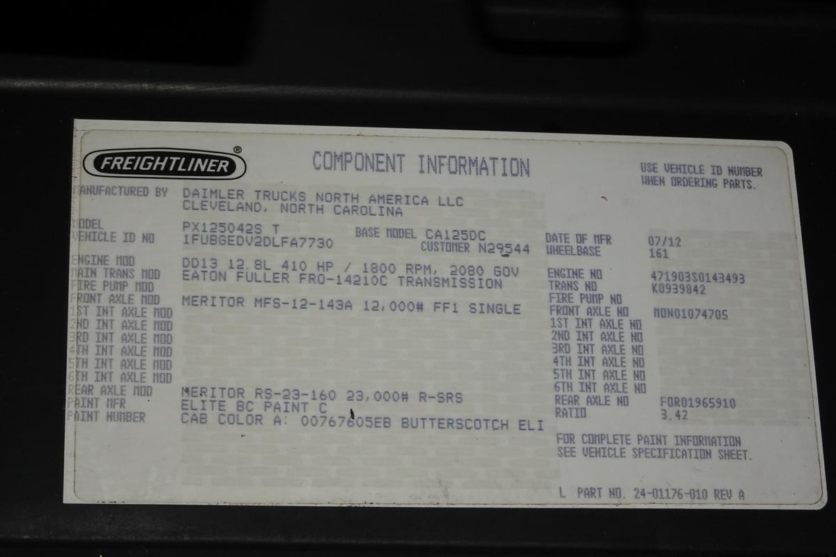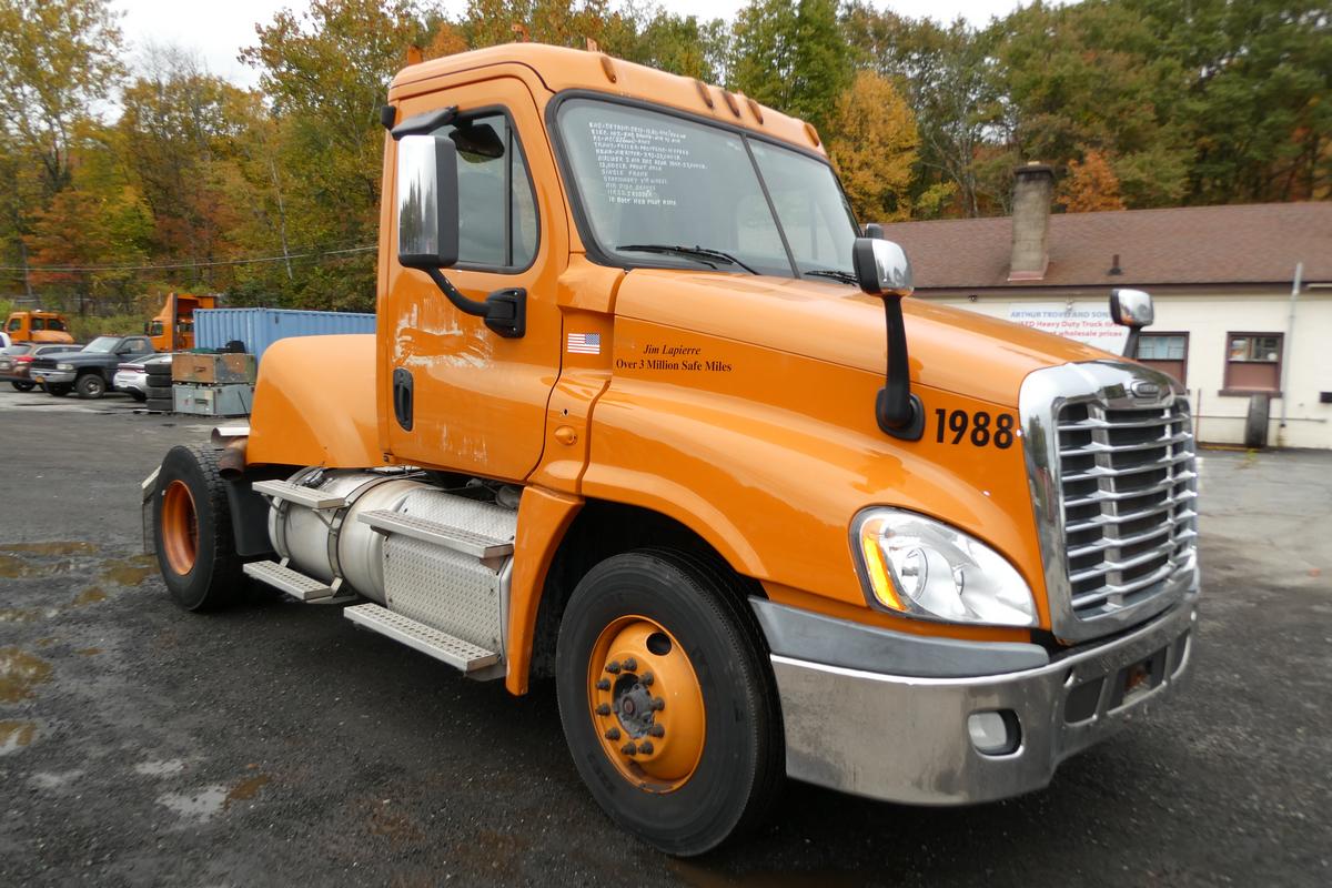 Inventory # 1014251Year: 2013 Make: Freightliner Model: Cascadia 125 Type: Single Axle Day Cab Tractor VIN: 1FUBGEDV2DLFA7730 Motor: Detroit DD13 12.8L Elec 410/500 HP - EGR Problems Air to Air: Yes Air Conditioning: Yes (Not Working) Engine Brake: Electronic DEF: Yes Transmission: Fuller FRO14210C 10 Speed PTO: No Front Axle: 12,000 lb Rear: Meritor RS23-160 23,000 lb Ratio: 3.42 Power Divider: No Suspension: Airliner 2 Air Bag 23,000 lb Tires: 11R22.5 Rims: 10 Bolt Hub Pilot - Steel Odometer Reading: 727,482 ECM: 29,652 Hour Meter Reading: 2,122 ECM Hour Reading: Length: 20'6" Width: 8' Height: 10' Wheelbase: 161" Cab to Axle: 86" Cab to End: 108" Weight: 14,940 lb GVW: 35,000 lb Added Features: Runs - Shuts Down After 2 Minutes, Will Restart Key Off For 1 Minutes, CANNOT BE DRIVEN NOR GO RORO, Single Frame, Stationary 5th Wheel, Air Disc Brakes Price: $3,900 as is as described NNY 1YDXXTCBJJXXTRQPLKDPABEJXRT+750+500 Terms of Sale