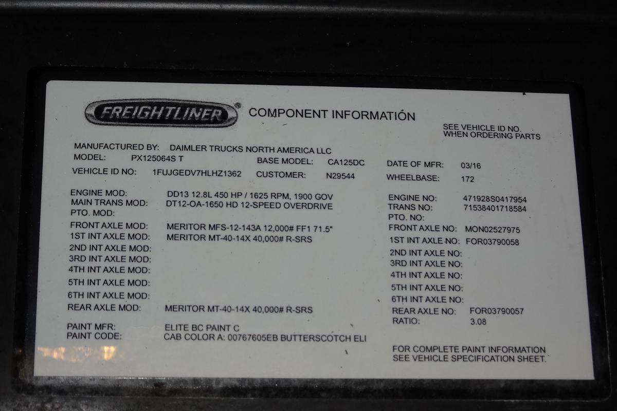Inventory # 1014252Year: 2017 Make: Freightliner Model: Cascadia 125 Type: Tandem Axle Day Cab Tractor VIN: 1FUJGEDV7HLHZ1362 Motor: Detroit DD13 12.8L elec 450/525 HP Air to Air: Yes Air Conditioning: Yes (Not Working) Engine Brake: Electronic DEF: Yes Transmission: Detroit DT12-OA-1650HD 12 speed automated manual (clutchless) - WON'T MOVE CAN'T BE DRIVEN PTO: No Front Axle: 12,000 lb Rear: Meritor MT40-14X 40,000 lb Ratio: 3.08 Power Divider: Yes Suspension: Airliner 4 Air Bag 40,000 lb Tires: 11R22.5 Rims: 10 bolt hub pilot - steel Odometer Reading: 741,976 ECM: 160,009 Hour Meter Reading: 19,048 ECM Hour Reading: Length: 23' Width: 8' Height w/ Folded: 10'6" Wheelbase: 172" Cab to Axle: 96" Cab to End: 140" Weight: 16,360 lb GVW: 52,000 lb Added Features: Runs Poor - Transmission Problem - WON'T MOVE CAN'T BE DRIVEN CANNOT GO RORO, Single Frame, Air Slide 5th Wheel, Air Disc Brakes Price: $5,900 as is as described NNY 1YDXXTCIJJXXTRQPLKDPABEJXRT+750+500 Terms of Sale