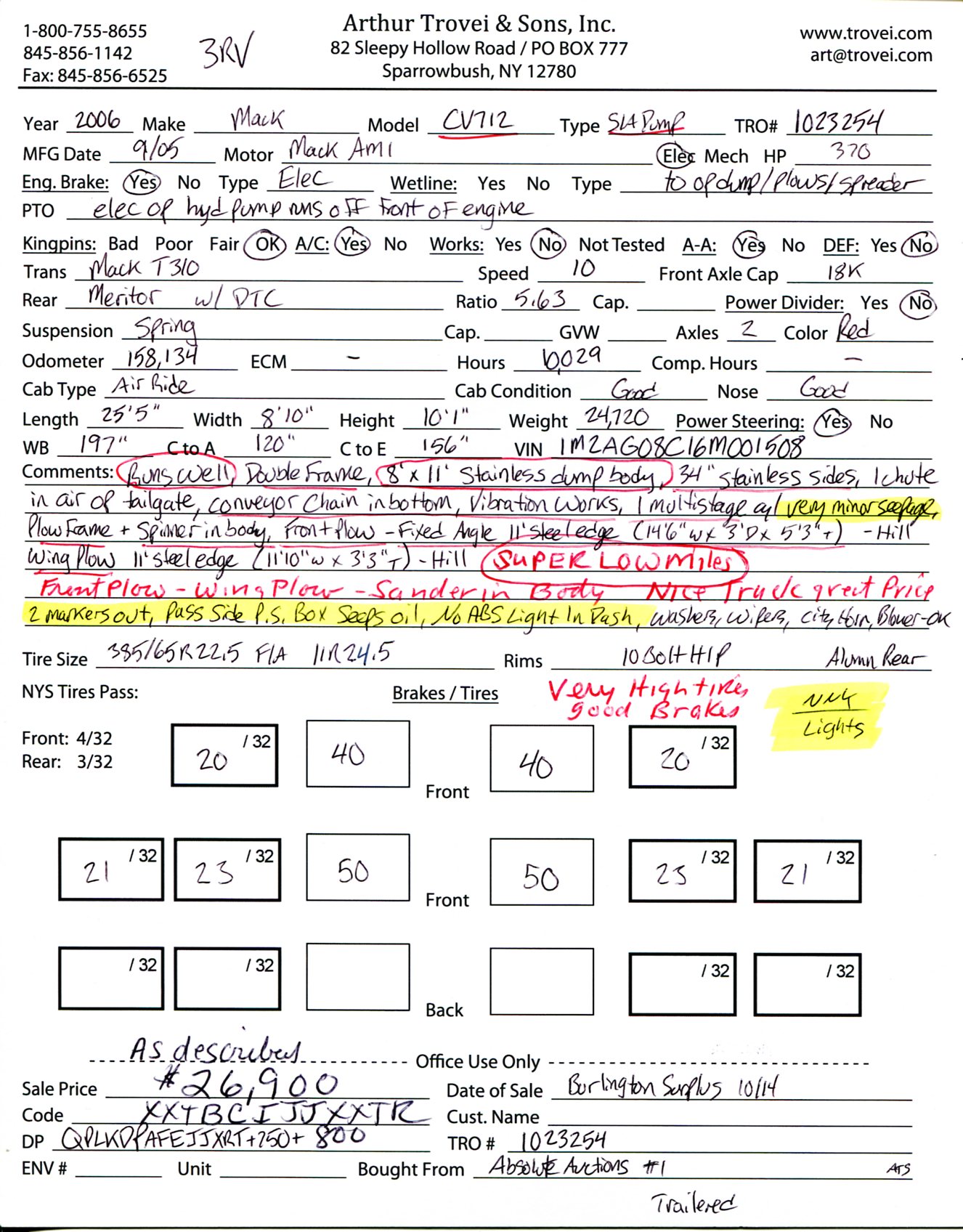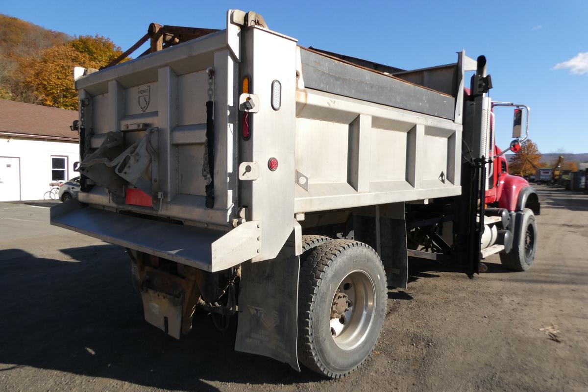 Inventory # 1023254Year: 2006 Make: Mack Model: CV712 Type: Single Axle Dump Truck VIN: 1M2AG08C16M001508 Motor: Mack AMI Elec 370 HP Wetline: Hydraulic For Dump / Plow / Sander Air to Air: Yes Engine Brake: Electronic Transmission: MAck T310 10 Speed PTO: Electric Operated Constant Run Front Mount Hydraulic Pump Rear: Meritor w/ DTC Ratio: 5.63 Power Divider: No Suspension: Spring Tires: 315/65R22.5 F/A - 11R24.5 R/A Rims: 10 Bolt Hub Pilot - Aluminum Rear Odometer Reading: 158,134 ECM: Hour Meter Reading: 10,029 Computer Hour Reading: Length: 25'5" Width w/ Wing Plow Mount: 8'10" Height: 10'1" Wheelbase: 197" Cab to Axle: 120" Cab to End: 156" Weight: 24,720 lb GVW: Dump Body: 8' x 11 Stainless Dump Body, 34" Stainless Sides, One Chute In Air Operated Tailgate, Vibration - Works, Conveyor Chain In Bottom Front Plow Details: 14'6" W x 5'3" T x 3' D, 11' Steel Edge, Fixed Angle (Hill) Wing Plow Details: 11'10" W x 3'3" T, 11' Steel Edge (Hill) Added Details: Runs Well, Double Frame, Air Brakes, 1x Multistage Cylinder - Works Well Very Minor Seepage, Plow Frame And Spiner In Body Price: $26,900 as described NNY 3RVXXTBCIJJXXTRQPLKDPAFEJJXRT+750+800 Terms of Sale