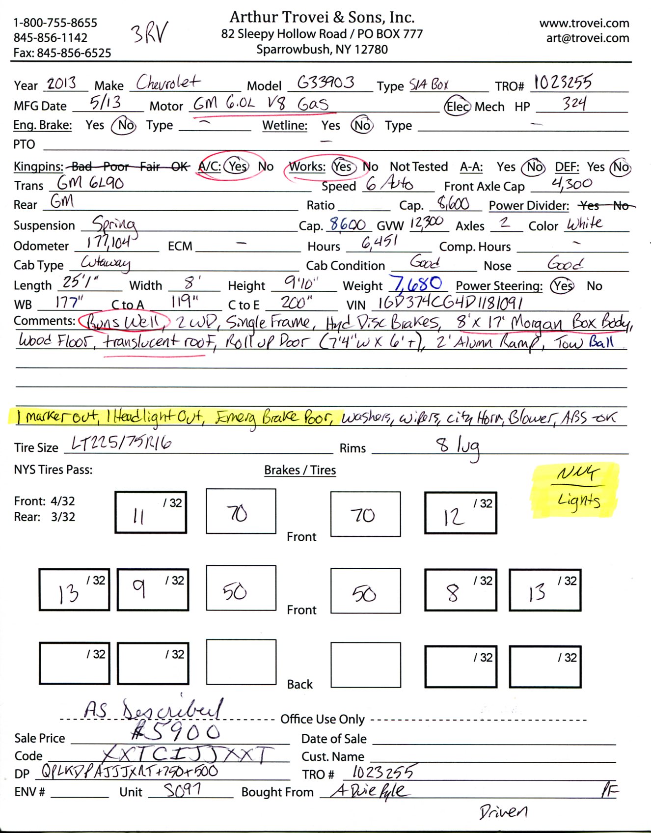 Inventory # 1023255Year: 2013 Make: Chevrolet Model: G33903 Type: Single Axle Box Truck VIN: 1GD374CG4D1181091 Motor: GM 6.0L V8 Gas Elec 324 HP Engine Brake: No Air to Air: No DEF: No Air Conditioning: Yes (Works) Transmission: GM GL90 6 Speed Automatic PTO: No Front Axle: 4,300 lb Rear: GM 8,600 lb Ratio: Suspension: Spring 8,600 lb Tires: LT225/75R16 Rims: 8 Lug Odometer Reading: 177,104 ECM: Hour Meter Reading: 6,451 Computer Hour Reading: Length: 25'1" Width: 8' Height: 9'10" Wheelbase: 177" Cab to Axle: 119" Cab to End: 200" Weight: 7,680 lb GVW: 12,300 lb Box Details: 8' Wide x 17' Long Morgan Box Body - Roll Up Door (7'4" W x 6' T), Steel Surround, Wood Floor, Translucent Roof Added Details: Runs Well, 2WD, Single Frame, Hydraulic Disc Brakes, 2' Aluminum Ram, Tow Ball Price: $5,900 as described NNY 3RVXXTCIJJXXTQPLKDPAJJJXRT+750+500 Terms of Sale