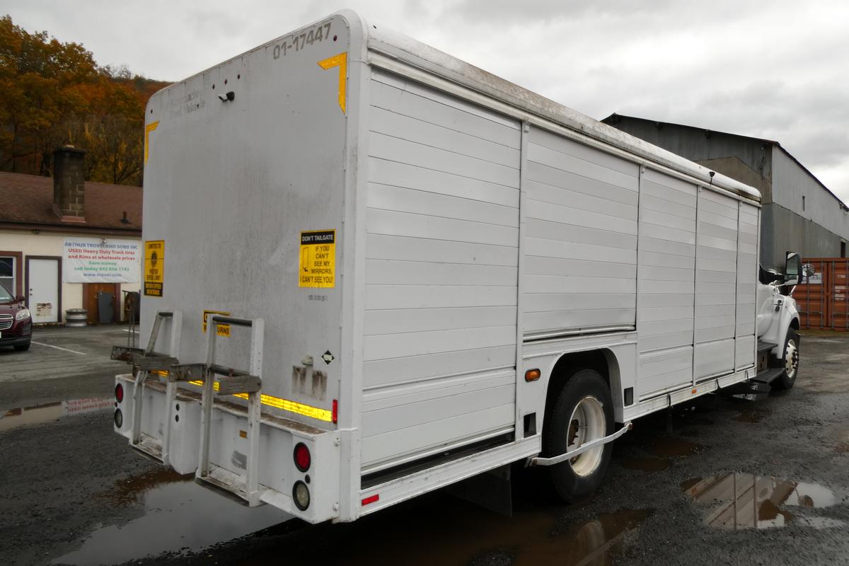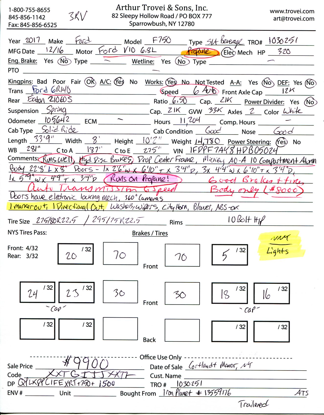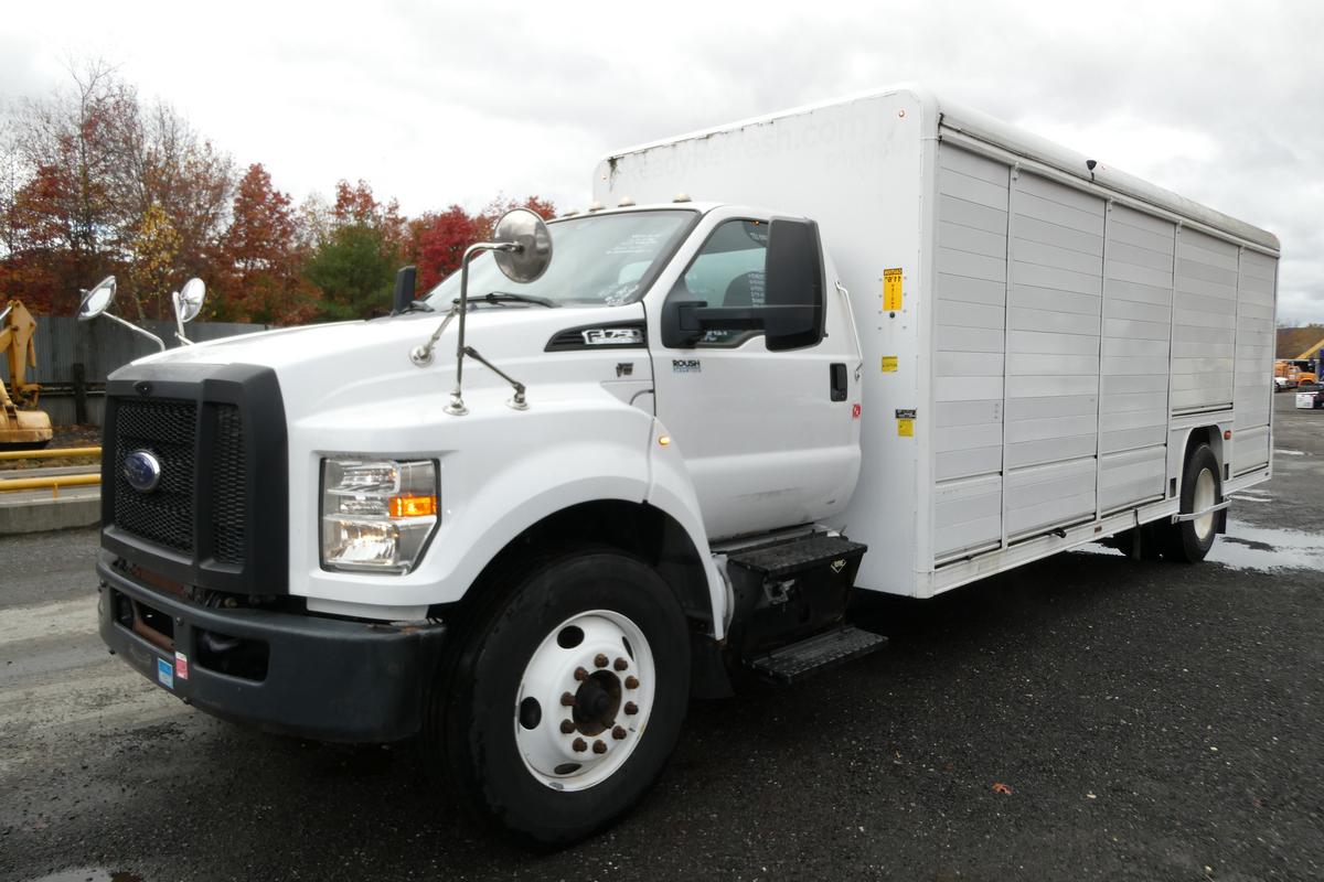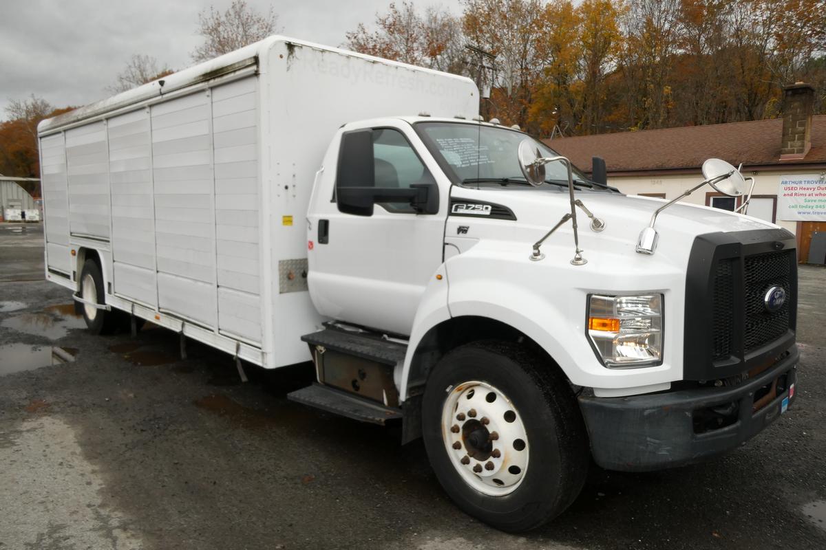 Inventory # 1030251Year: 2017 Make: Ford Model: F750 Type: Single Axle Beverage Truck VIN: 1FDPF7AY8HDB05024 Motor: Ford V10 6.8L Elec 320 HP - Propane Engine Brake: No Air to Air: No Air Conditioning: Yes (Works) Transmission: Ford 6R140 6 Speed Automatic PTO: No Front Axle: 12,000 lb Rear: Dana Spicer 21060S 21,000 lb Ratio: 6.507 Suspension: Spring 21,000 lbs Tires: 275/80R22.5 / 295/75R22.5 Rims: 10 Bolt Hub Pilot Odometer Reading: 105,642 ECM: Hour Meter Reading: 11,204 Comp Hour Reading: Length: 33'9" Width: 8' Height: 10'2" Wheelbase: 281" Cab to Axle: 187" Cab to End: 275" Weight: 14,780 lb GVW: 33,000 lb Box Details: 8' Wide x 22'8" Long Mickey A0-A Aluminum Body - 10 Bays (5 Per Side), Non-Insulated, Bays are: 1x 2'6" W x 6'10" T x 3'4" D | 1x 5'9" W x 4'9" T x 3'4" D | 3x 4'4" W x 6'10" T x 3'4" D Added Details: Runs Well, Drop Center Frame, Hydraulic Disc Brakes, Runs On Propane, 360 Cameras, Electonic Locking Mechanisms On Body Price: $9,900 NNY 3RVXXTGIJJXXTRQPLKDPCIFEXRT+750+1500 Terms of Sale