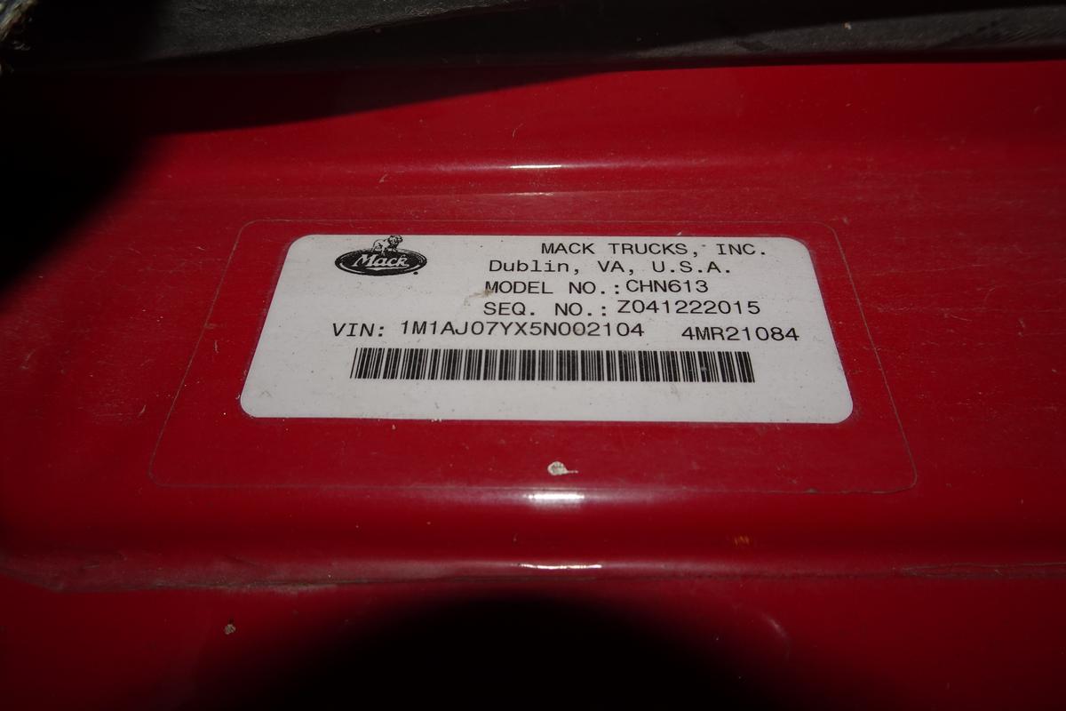 Inventory # 1104251Year: 2005 Make: Mack Model: CHN613 Type: Tandem Axle Day Cab Tractor VIN: 1M1AJ07YX5N002104 Motor: Mack AC Elec 460 HP - CORE TURNS DOES NOT RUN Air to Air: Yes Air Conditioning: Yes (Not Tested) Engine Brake: Elec Transmission: Fuller RTLO16918B 18 Speed PTO: Air Operated Bottom Mount With Married Cable Operated Hydraulic Pump Wetline: To Operate Dump / Lowboy Front Axle: 12,000 lb Rear: Mack 40,000 lb Ratio: 3.94 Power Divider: Yes Suspension: Mack 4 air bag 40,000 lb Tires: 11R22.5 Rims: 10 Bolt Hub Pilot Odometer Reading: Unavailable ECM Reading: Hour Meter Reading: ECM Hour Reading: Length: 25' Width: 8' Height: 9'5" Wheelbase: 208" Cab to Axle: 122" Cab to End: 170" Weight: 16,640 lb GVW: 52,000 lb Added Details: CORE TURNS DOES NOT RUN, Single Frame, Air Slide 5th Wheel Price: $8,900 as is as described 1YDXXTGEJJXXTRQPLKDPEAGBXRT+750+600 Terms of Sale