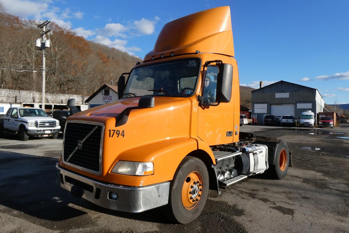Inventory # 1110241Year: 2012 Make: Volvo Model: VNM42T Type: Single Axle Day Cab Tractor VIN: 4V4M19DG6CN550244 Motor: Volvo D11 10.8L elec 385 hp Air to Air: Yes Air Conditioning: Yes (Not Working) Engine Brake: Electronic DEF: Yes Transmission: Fuller FRO14210C 10 speed PTO: No Front Axle: 12,000 lb Rear: Meritor MS23-16 23,000 lb Ratio: 3.42 Power Divider: No Suspension: Volvo 2 air bag 20,000 lb Tires: 11R22.5 Rims: 10 bolt hub pilot - steel Odometer Reading: 438,311 ECM: 438,311 Hour Meter Reading: ECM Hour Reading: 985* Length: 19'9" Width: 8' Height w/ fairing: 12'10" Wheelbase: 154" Cab to Axle: 90" Cab to End: 115" Weight: 13,320 lbs GVW: 32,000 lbs Added Features: Runs Well, single frame, stationary 5th wheel, air disc brakes Price: Sold 2STXXTDIJJXXTRQRTVDPBEJJXRT+750+300 Terms of Sale